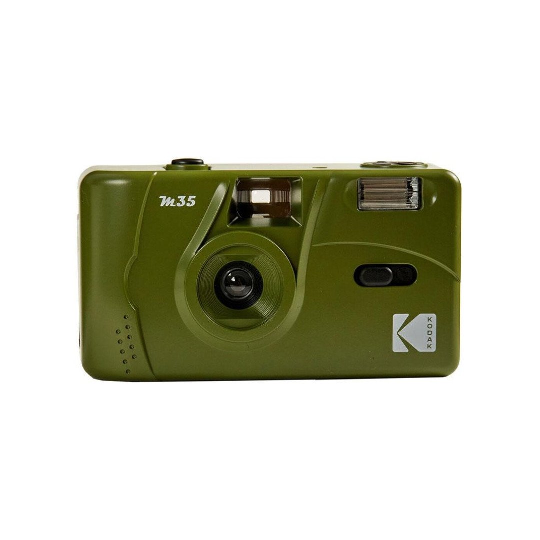 La cámara de película Kodak M35 con flash es una pequeña cámara reutilizable que utiliza película de 35 mm. Esta cámara cuenta con un objetivo de enfoque fijo de 31 mm, bobinado y rebobinado manual de la película y un flash incorporado con un interruptor de encendido y apagado.