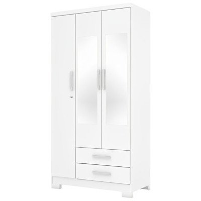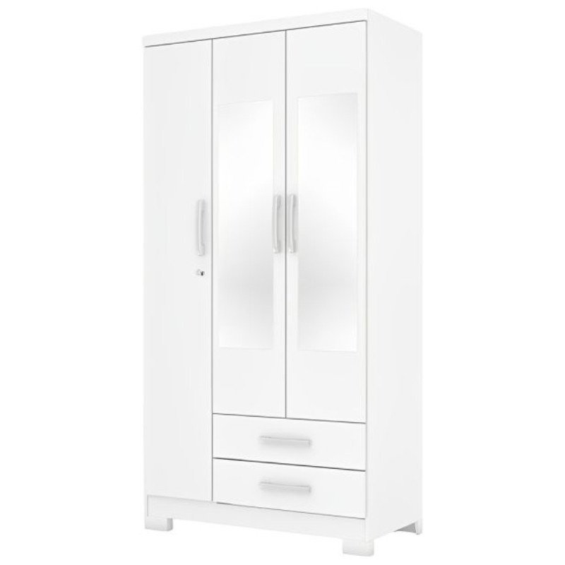 Mueble versátil y espacioso con 3 puertas y 2 cajones equipados con correderas metálicas. Incluye espejos integrados en las puertas frontales, barras para colgar y espacio para guardar objetos diversos como ropa y zapatos.