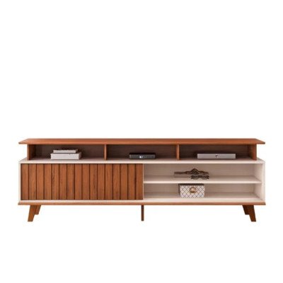 Mueble funcional y contemporáneo diseñado para salas y espacios medianos. Cuenta con tampo con borde frontal biselado, una puerta corrediza con adornos decorativos y patas de polipropileno para mayor resistencia y estilo.